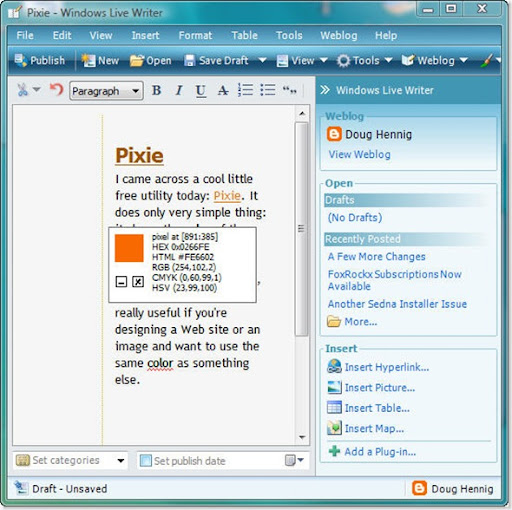 I came across a cool little free utility today: Pixie. It does only one very simple thing: it shows the color of the pixel under the mouse in various measurement systems: HTML, RGB, hex, CYMK, and HSV. This is really useful if you're designing a Web site or an image and want to use the same color as an existing image. In the image below, the mouse pointer isn't shown, but it's over the orange part of the Blogger icon in the "Weblog" box at the right.